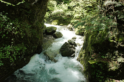 苔の彩りも鮮やか、照りつける太陽の暑さは沢の清涼感で抜群の快適トレック。